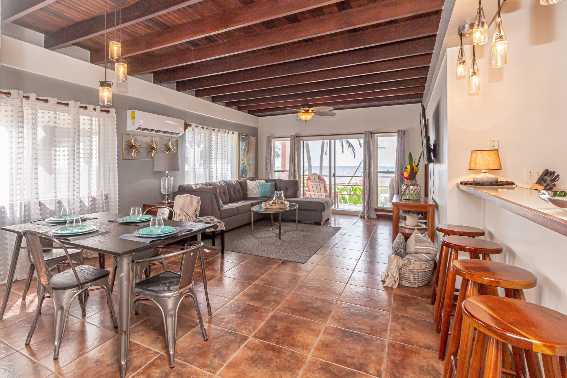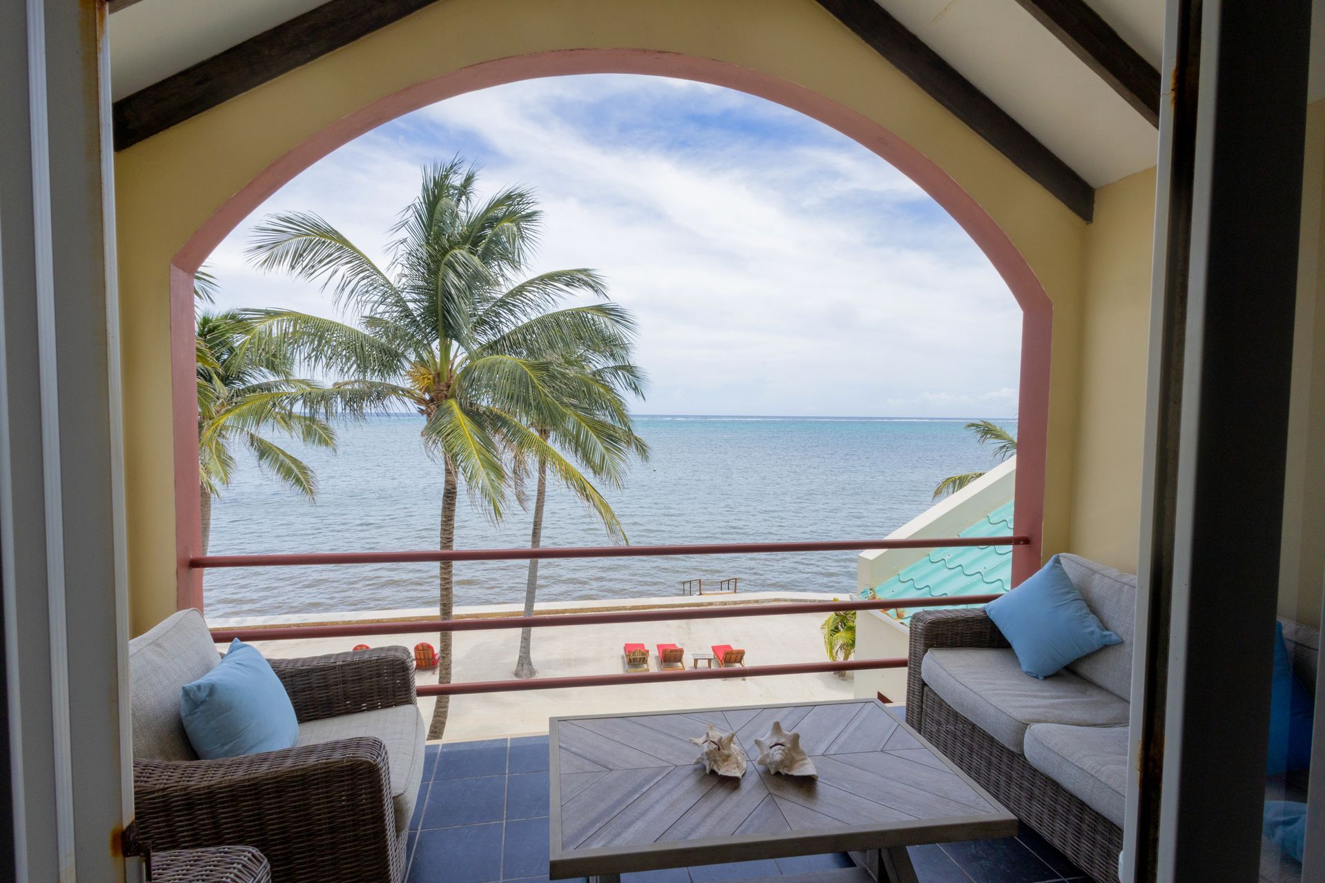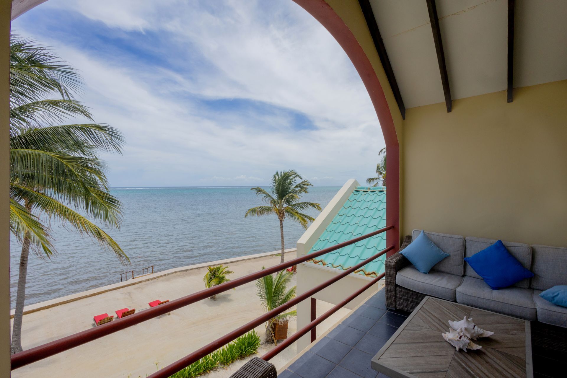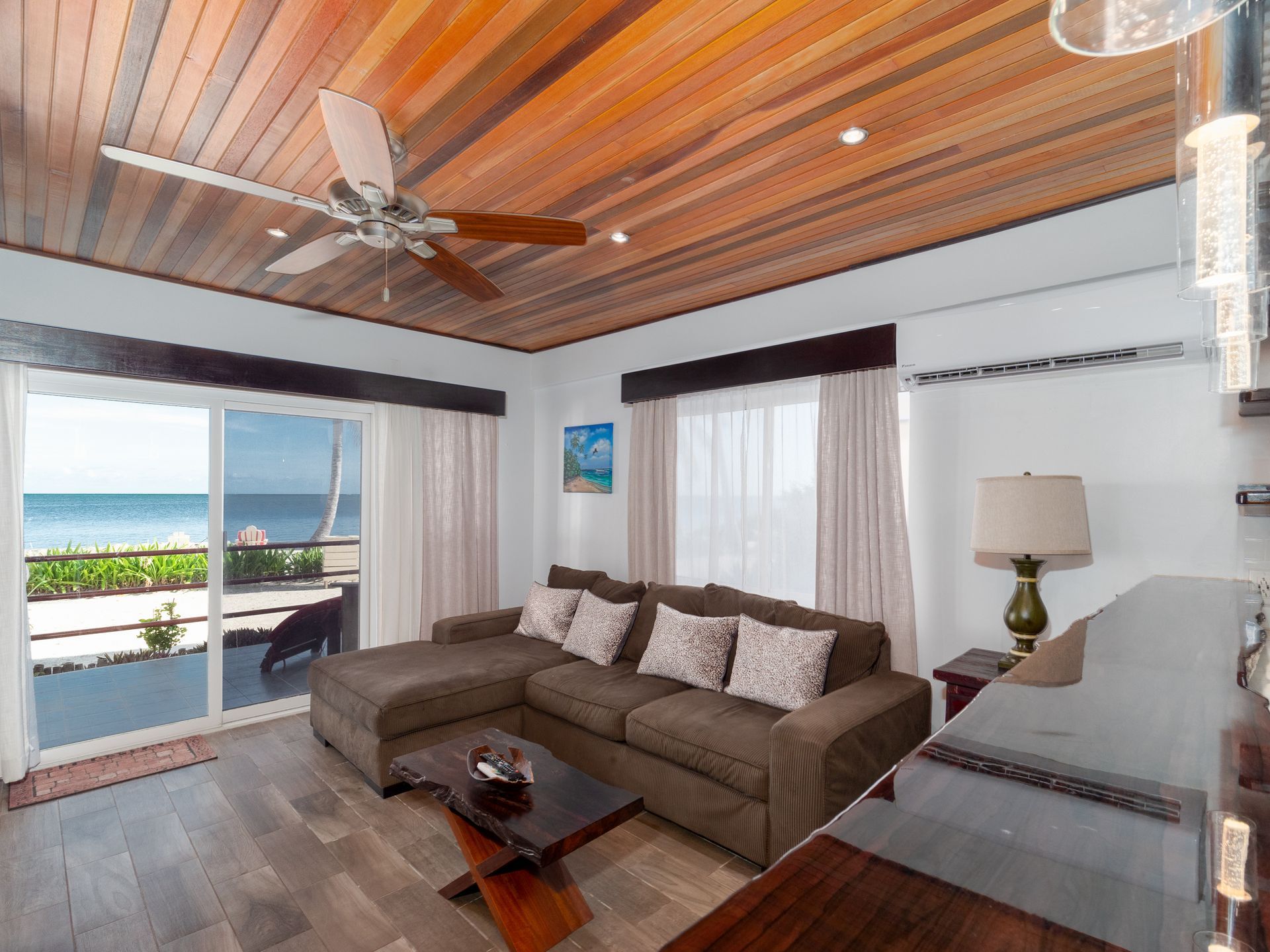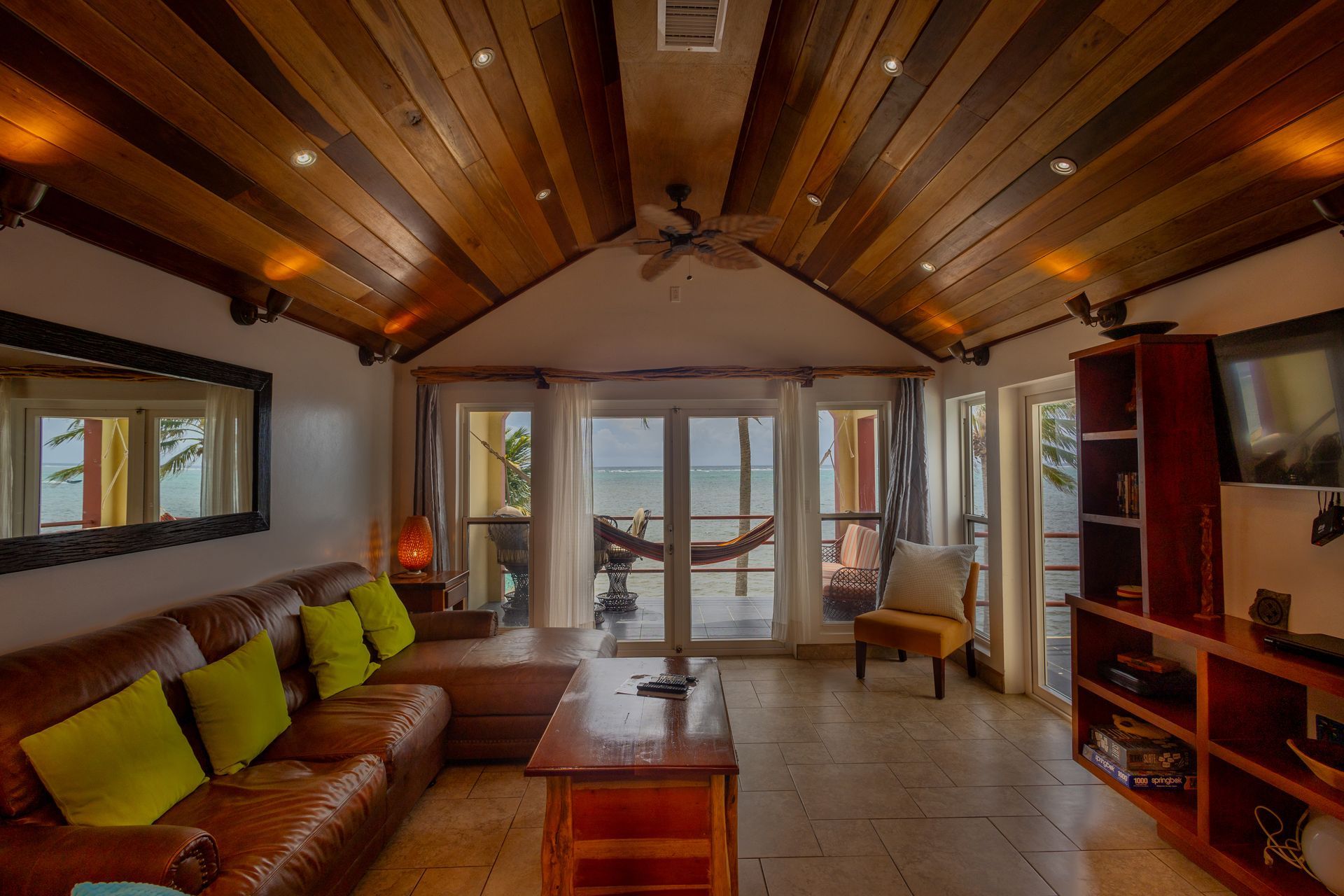A stunning penthouse featuring Belizean hardwood finishes and multiple outdoor spaces with panoramic beachfront views