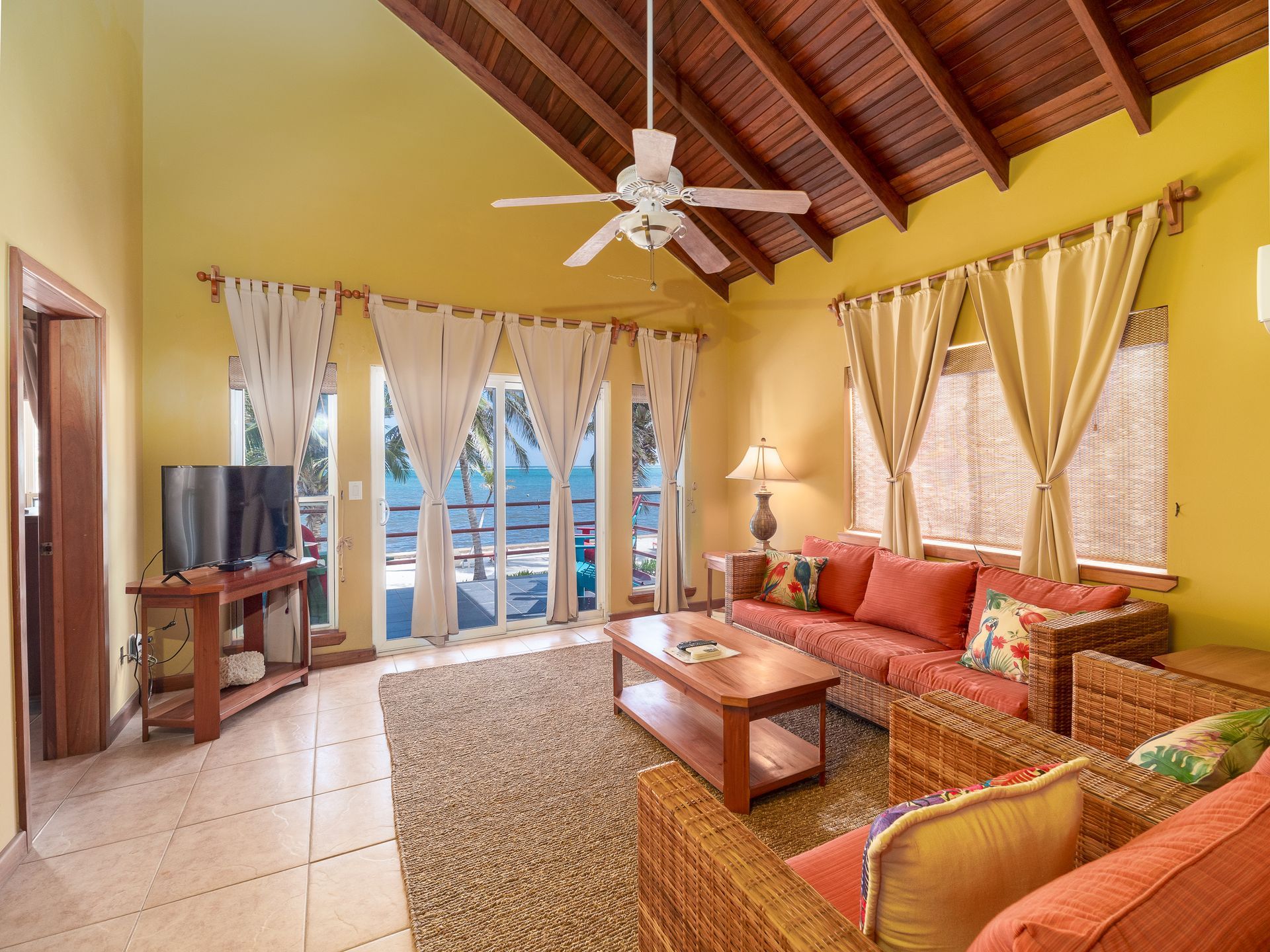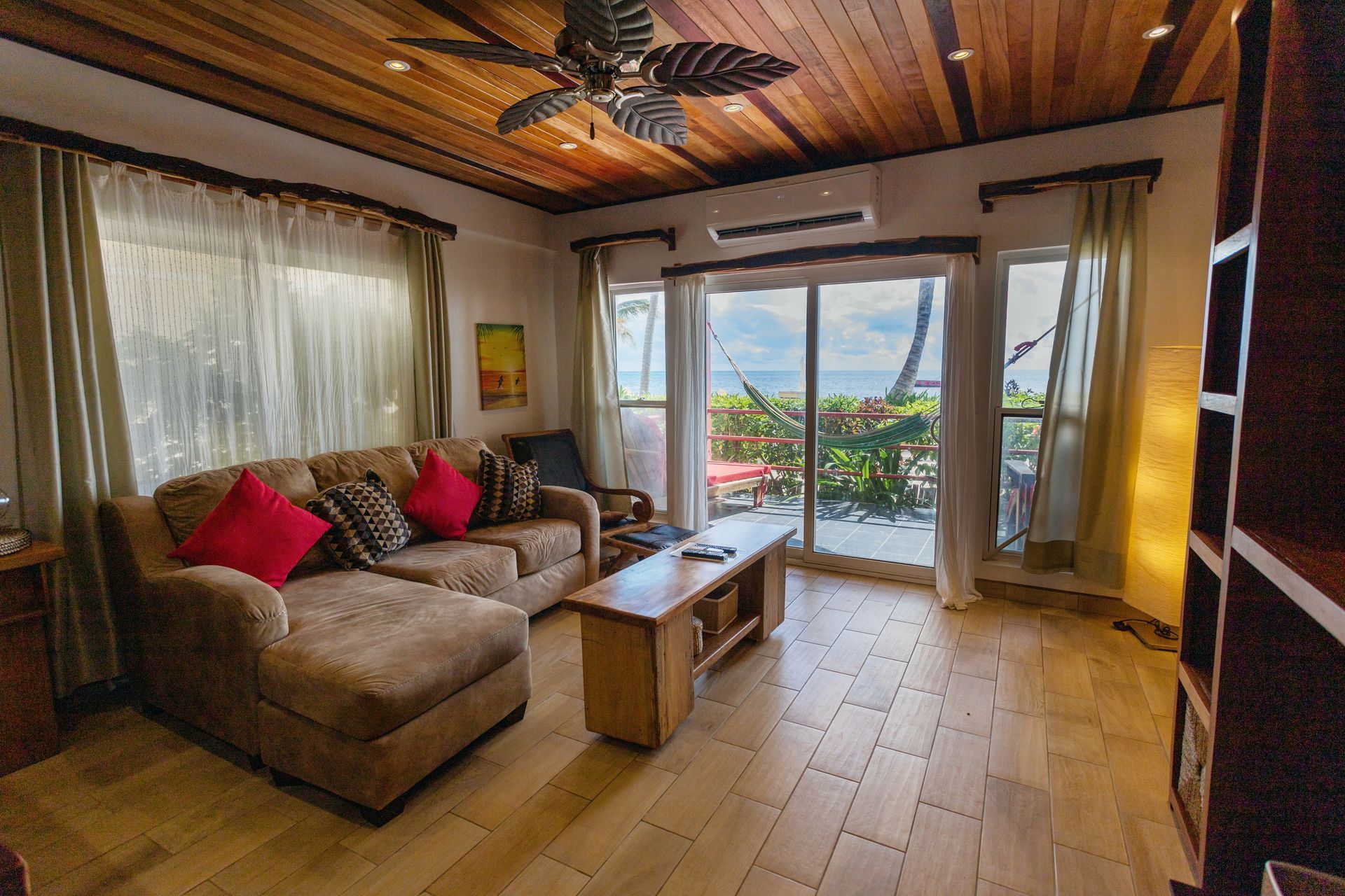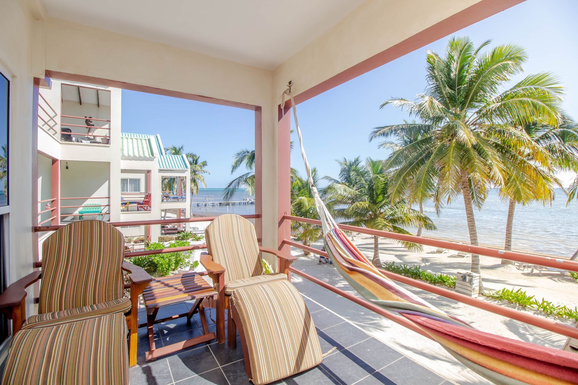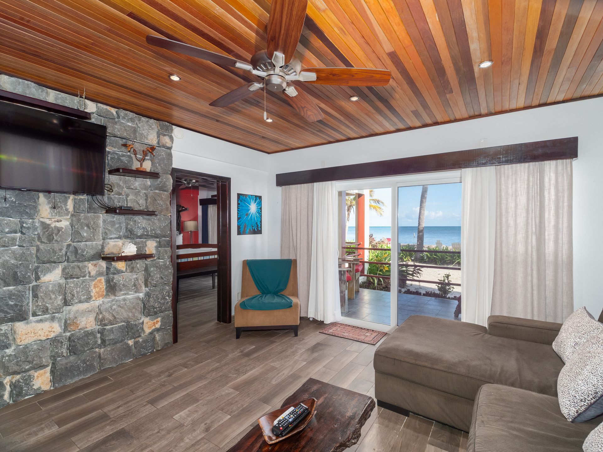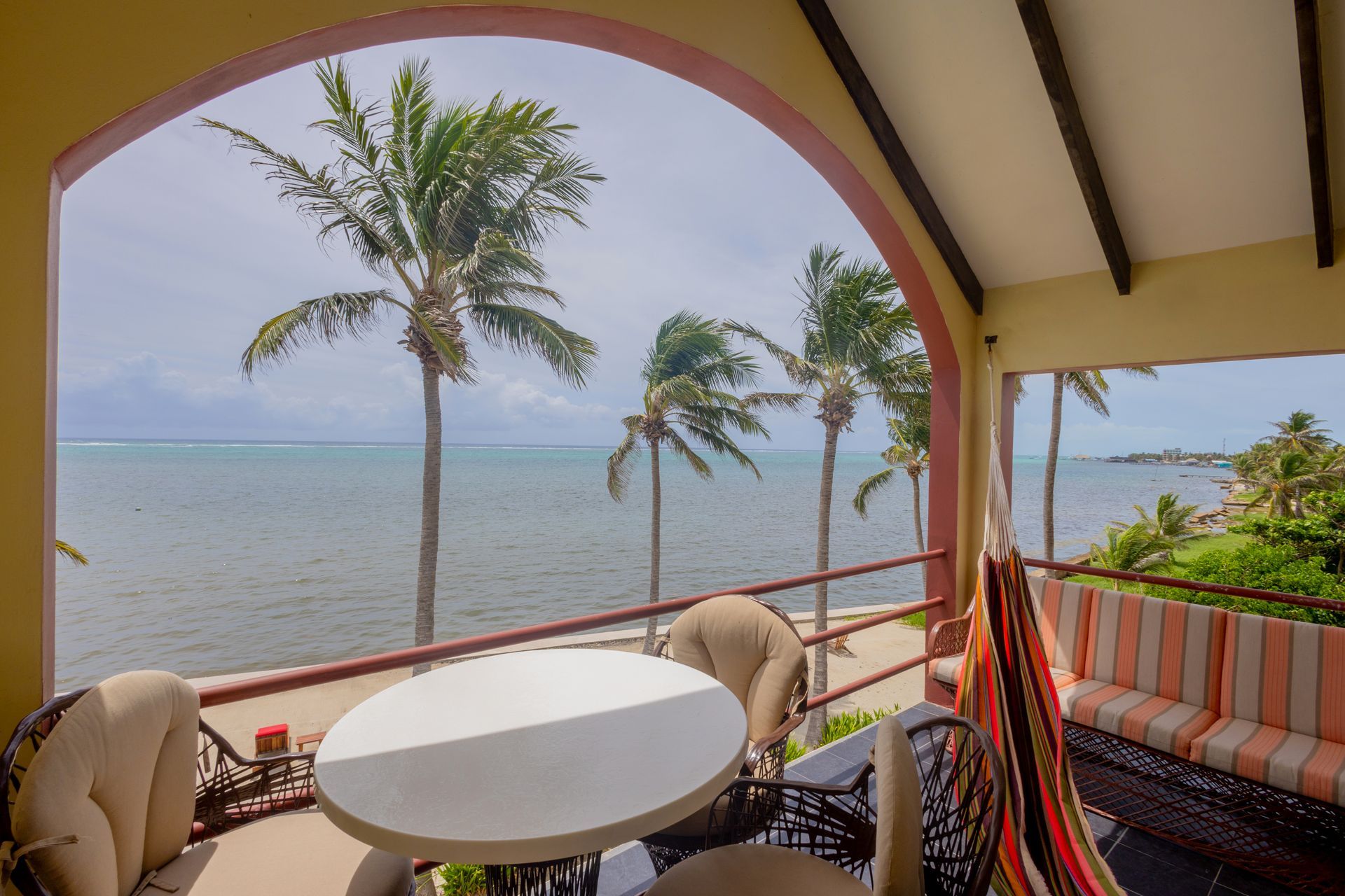A stunning penthouse featuring Belizean hardwood finishes and multiple outdoor spaces with panoramic beachfront views